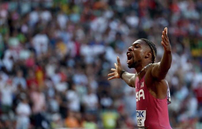 2023年8月20日,美国选手莱尔斯在2023世界田径锦标赛男子100米决赛后庆祝。新华社记者 李颖 摄