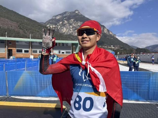 米兰时间3月13日,米兰冬残奥会冬季两项男子站姿短距离追逐赛的终点线前,来自云南的蔡佳云以0.2秒的微弱优势反超对手,将自己在本届赛事的第三枚金牌收入囊中。